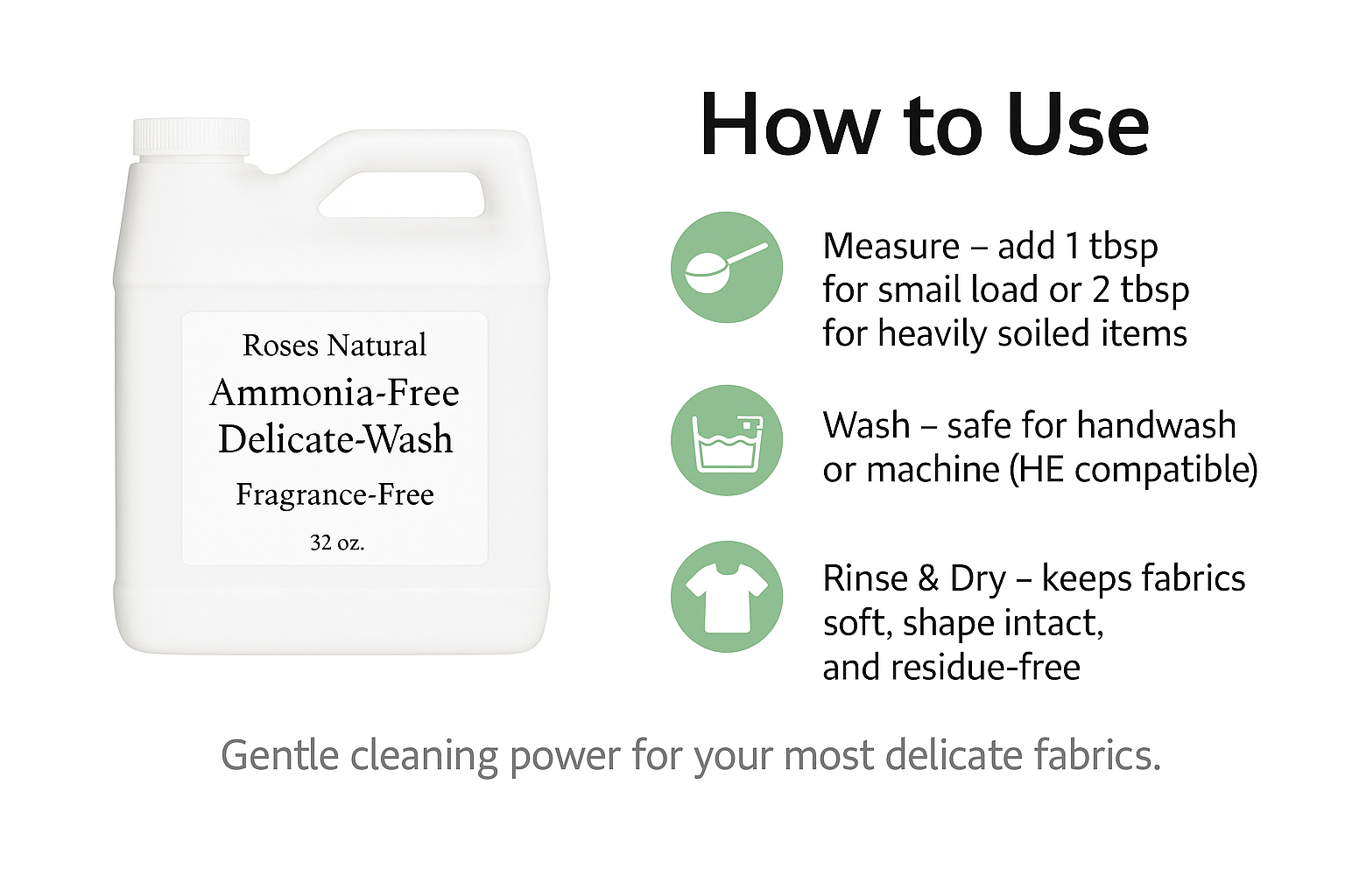 Keep your delicate garments clean and soft with Roses Natural Fragrance-Free Ammonia-Free Delicate Wash. Handmade with natural surfactants and lanolin, this gentle yet effective formula cleans without harsh chemicals, making it perfect for sensitive skin and delicate fabrics like silk, wool, lace, and lingerie.
