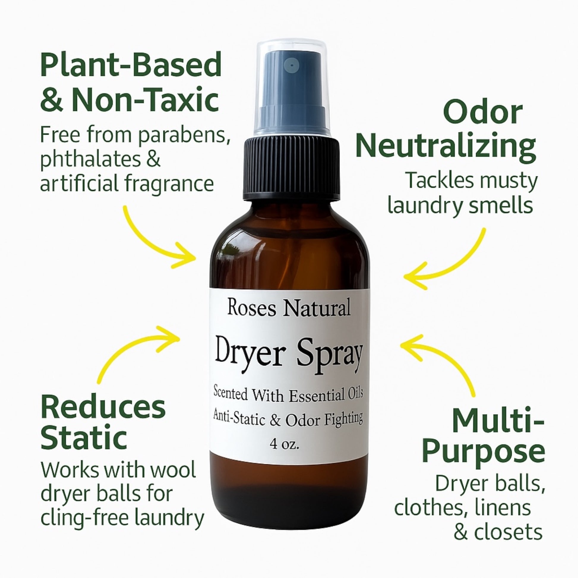 Freshen your laundry the natural way with Roses Natural Dryer Ball Spray. Handmade with a blend of pure, plant-based essential oils, this spray is the perfect companion for your dryer balls—giving your clothes a light, refreshing scent without synthetic fragrances or harmful chemicals.